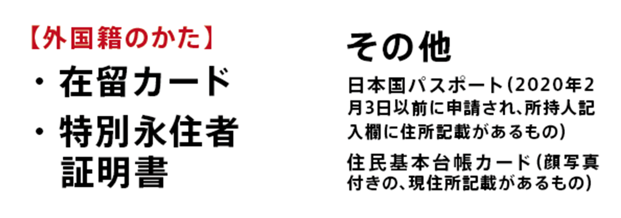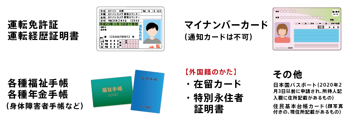 お客様の「氏名・生年月日・現住所」が確認できる本人確認書類(下記参照)のご提示をお願いいたします。