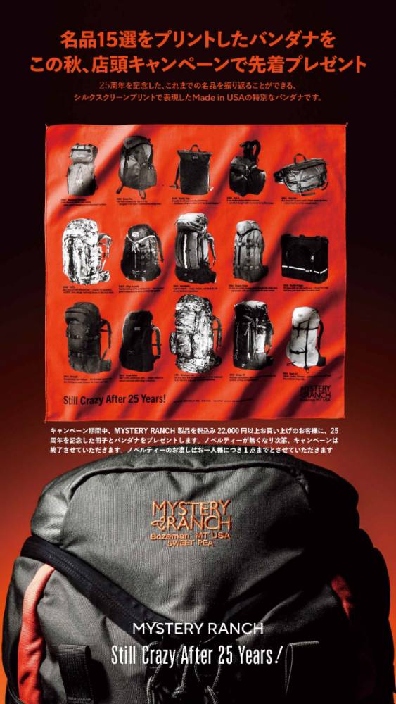 この節目を記念し、MYSTERY RANCH のブランドマインドを改めてご紹介する小冊子と、レガシーを製品軸で振り返る特別なバンダナを制作。バンダナは歴代の名品15 選をシルクスクリーンプリントした、Made in USA の限定アイテムです。