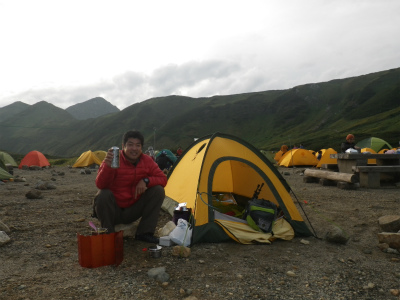 日暮れとともに雨がふりだしたので宴会終了。シュラフにもぐりこみ、今日一日が無事終わりました。