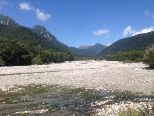 黒部川を渡ります。白い石と青く澄んだ水の流れ、尾根が重なり合う谷の姿にしばし見とれました。