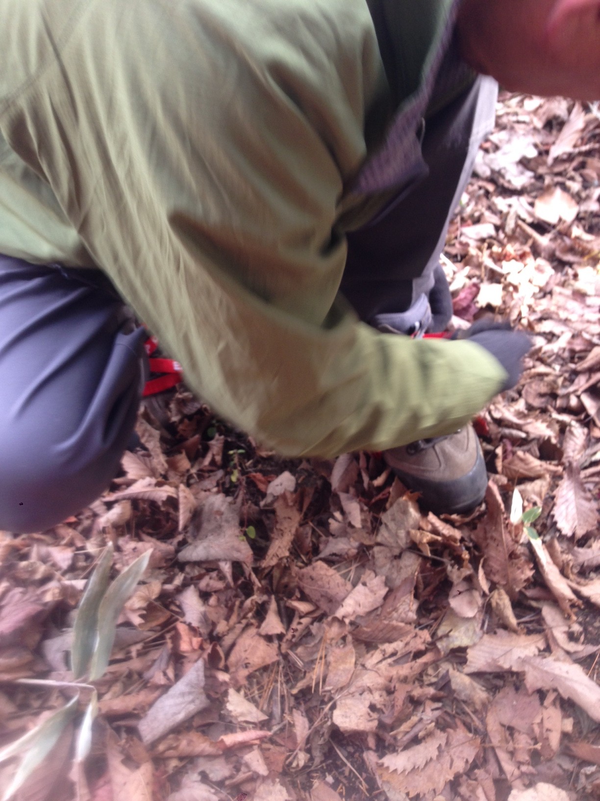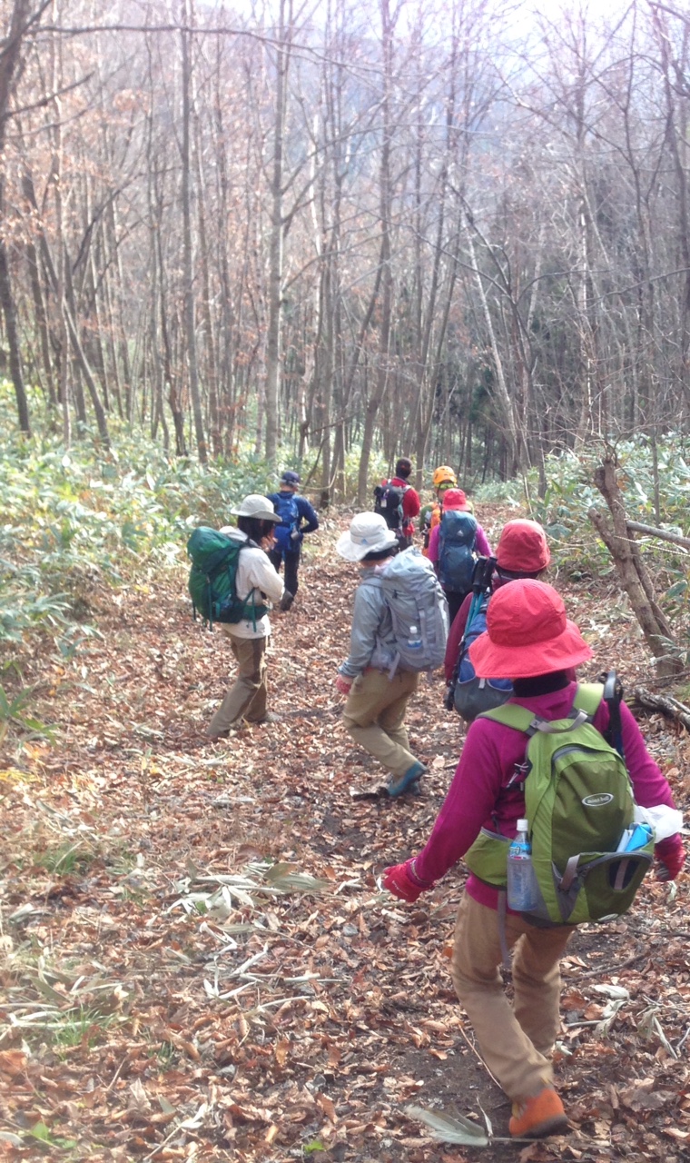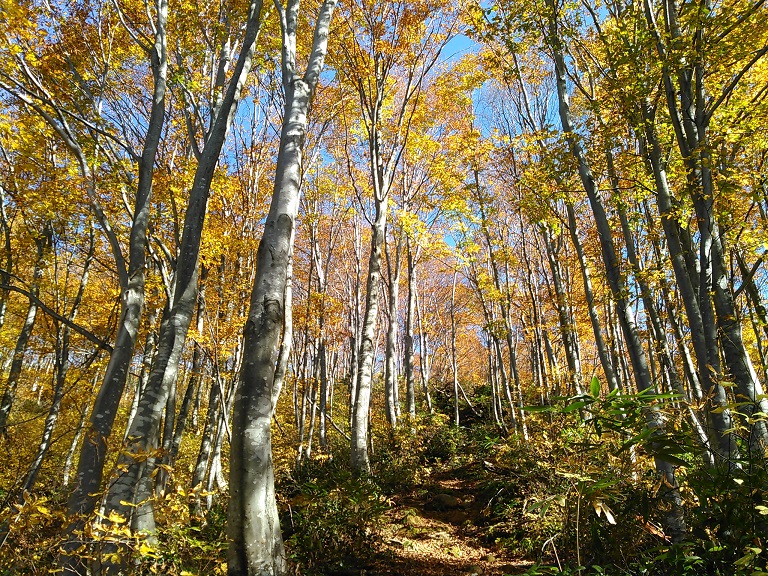 面白くってスリリングな岩場が終わったとたん、ゆるーい樹林帯。そのあとは笹っぱらを突き進みます。