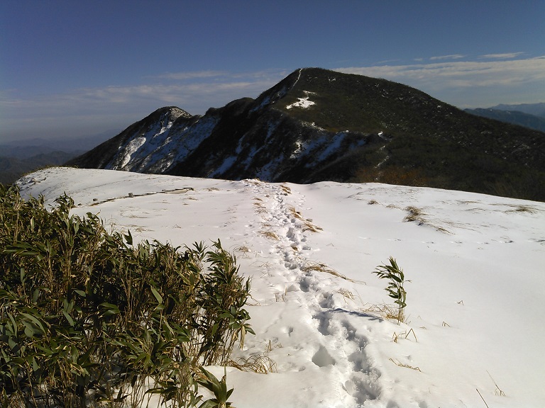 風もビュービューなので、山頂をさっさとあとにして、県界尾根から下山します。