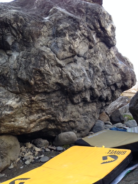左上に見えるチョーク跡のついたカンテが「ATARI」ランディングの3分の1が切れ込んで崖です。超危険課題。でも美しい!ここのエリア西海岸のクライマーが多く集まり(みんな犬をを一緒に連れてきていてとても楽しそう)岩の高さも日本のボルダーとさほど変らずワールドクラスの「HULK」や「ATARI」「SOLARIUM」といった名課題がたくさんあります