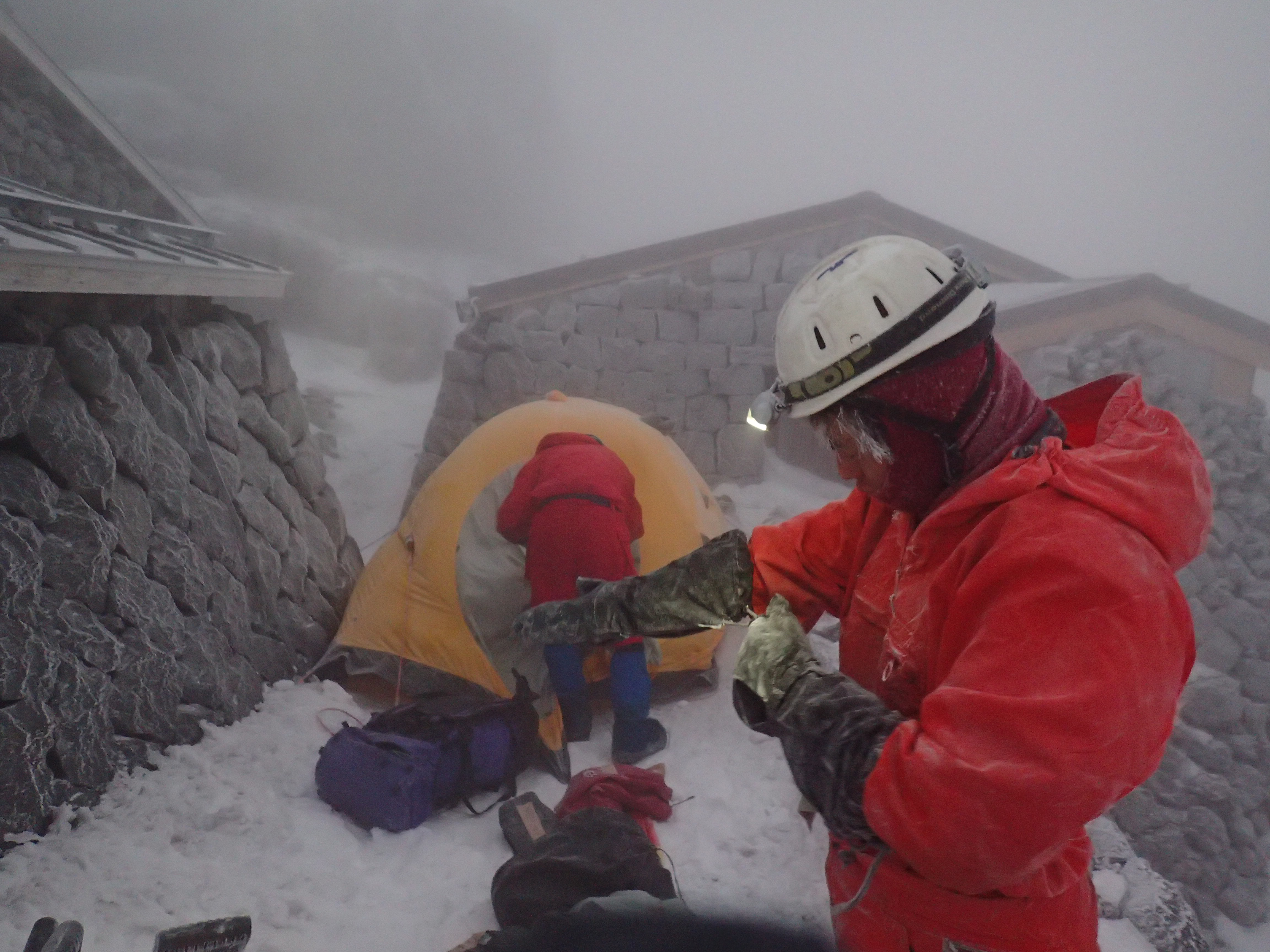 雨がヒドイので、滝谷避難小屋にて作戦を練ります\(^o^)/