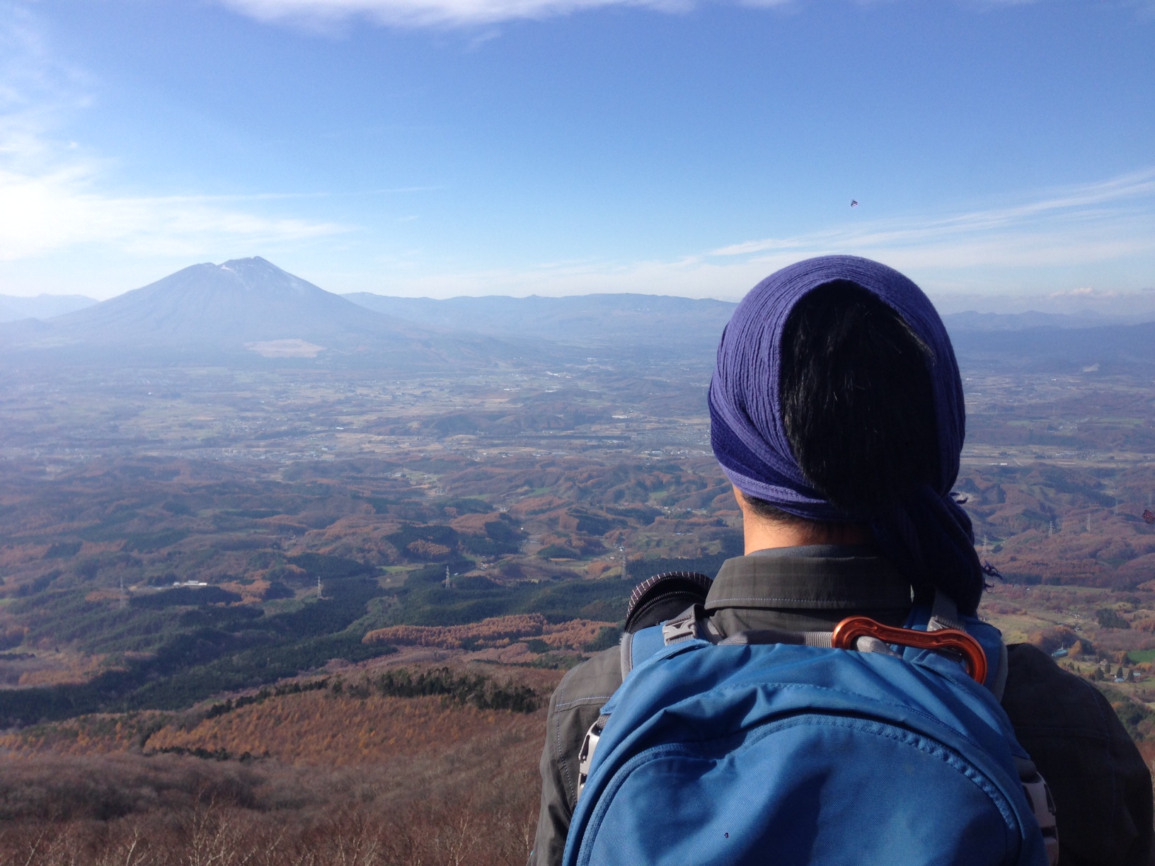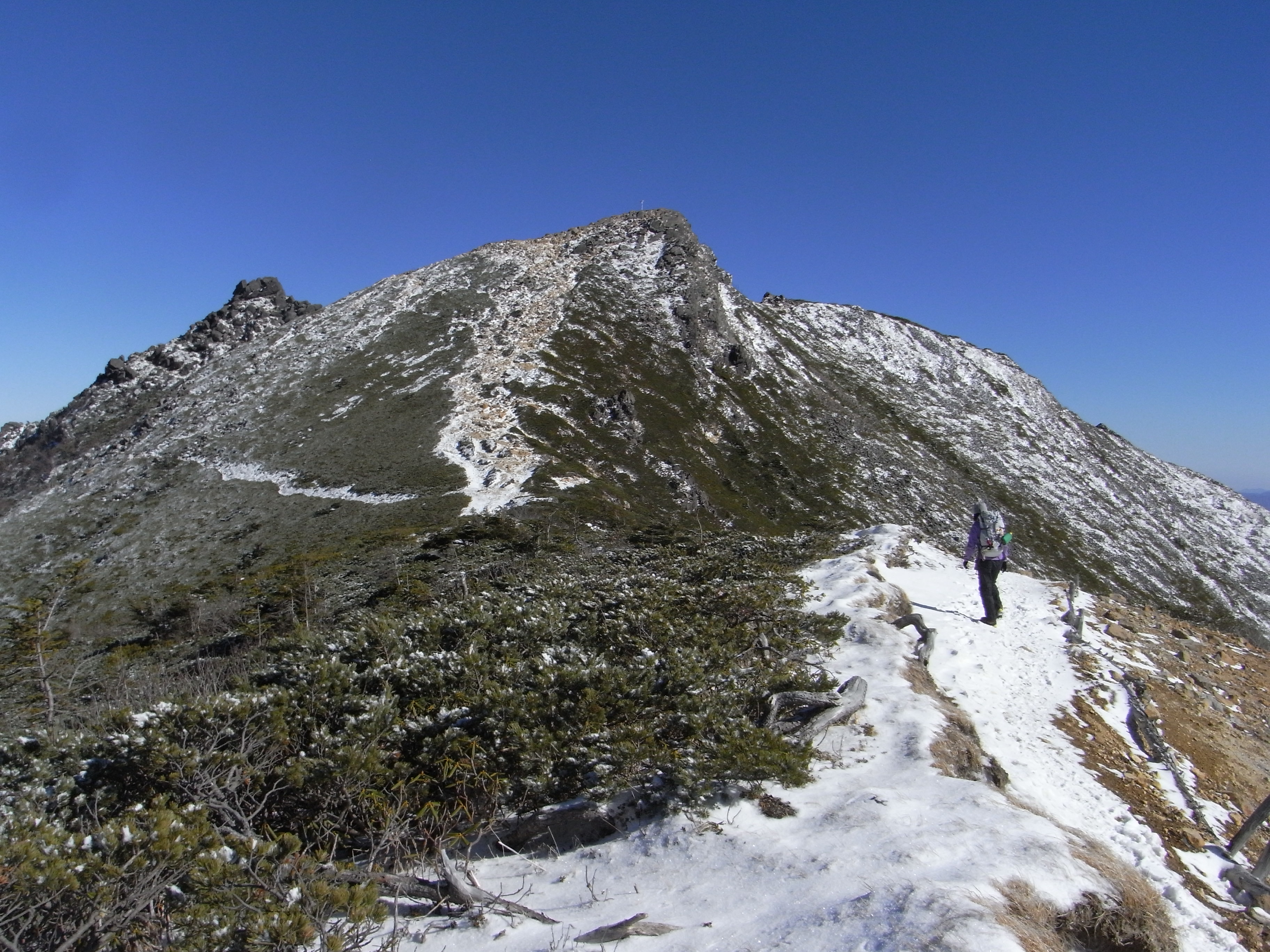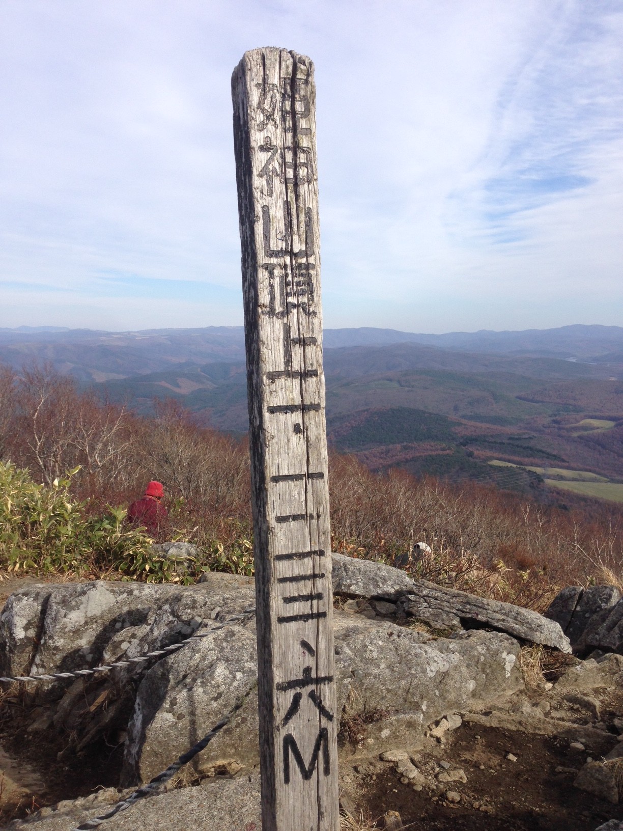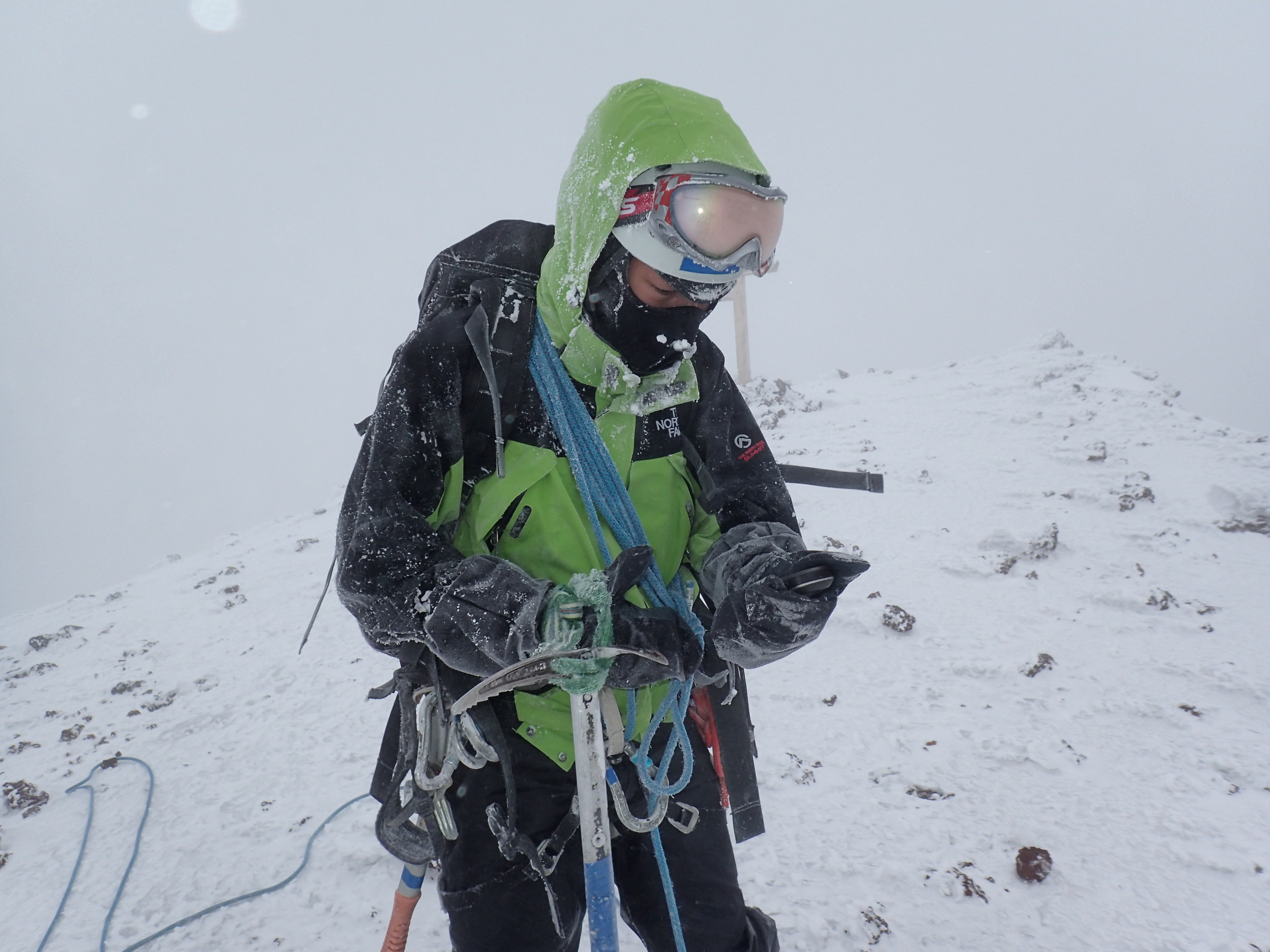 山頂到着。直下のところはヤバかった。登山道が凍っていて滑って落ちるかと思いました。