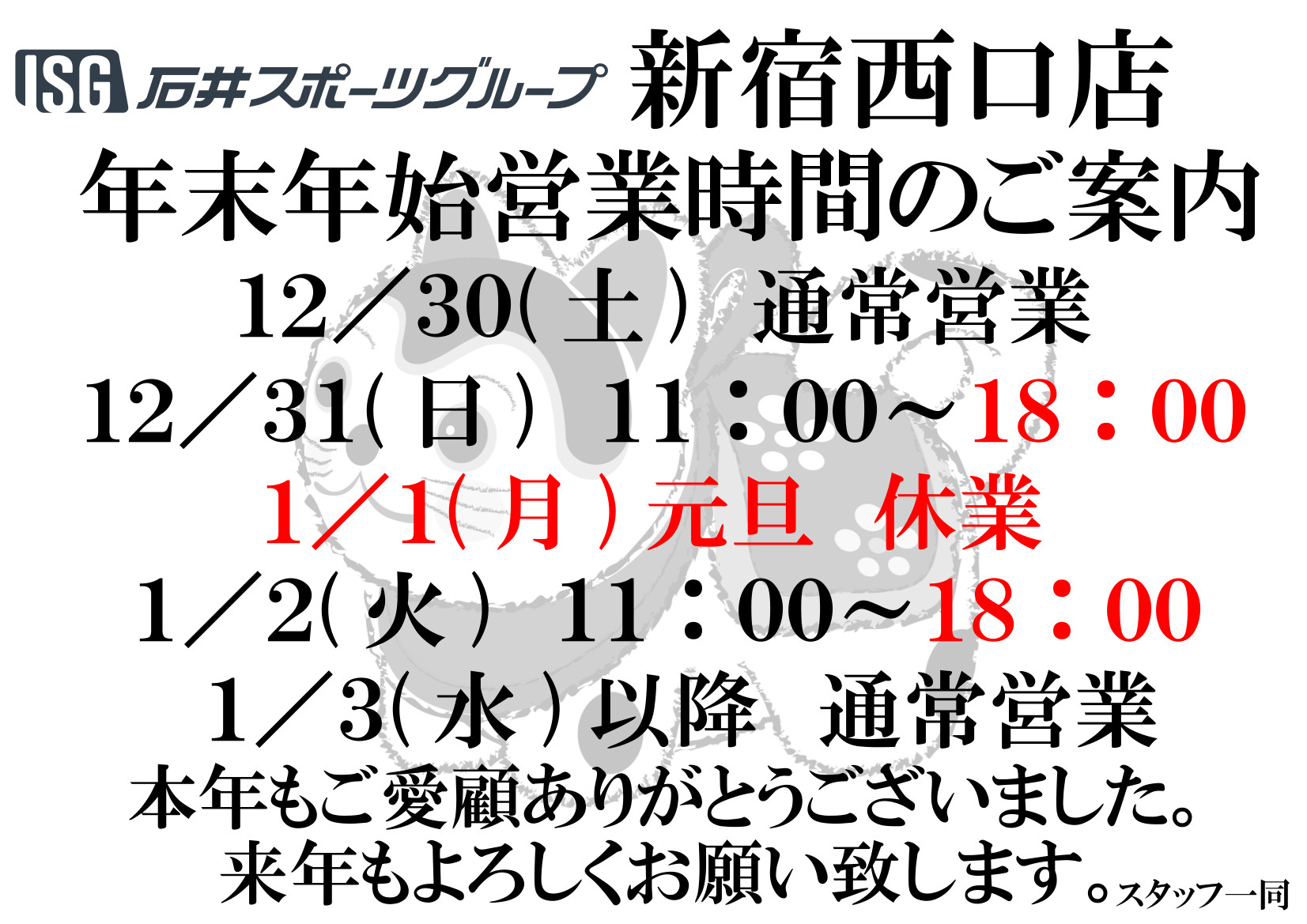 年始営業開始は 1月 2日 (火) 10:00~18:00
