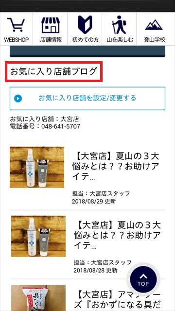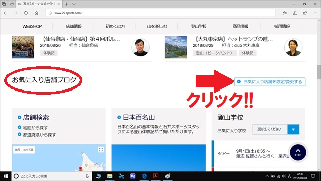 ③選択された店舗のブログが、石井スポーツHPのトップページに表示されるようになります(変更は簡単にできます)