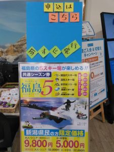 5スキー場共通シーズン券大人¥9,800、子供¥5,000の『福島5』が本日店内にて発売中!!
