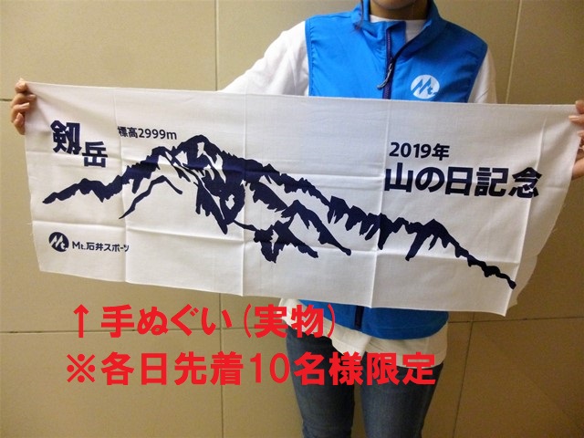 2019年8月3日(土)~8月11日(日)までの期間中(8/6(火)除く※)、Mt.石井スポーツ各店にて、10,000円以上お買い上げのお客様で各日先着10名様に「山の日記念てぬぐい(2019年版)」をプレゼント!