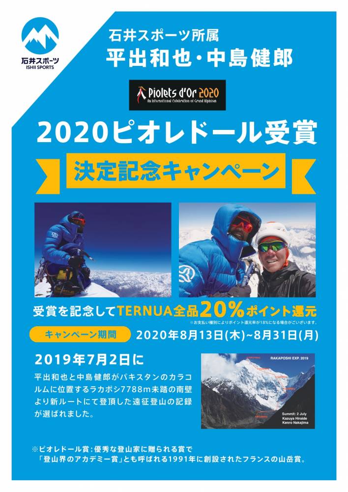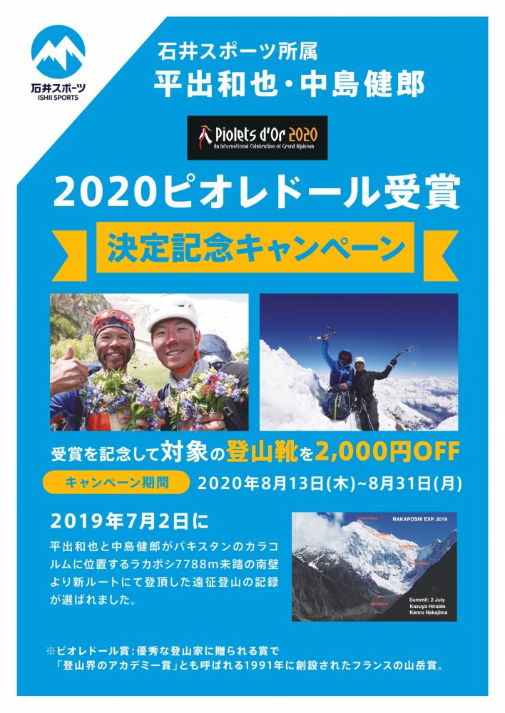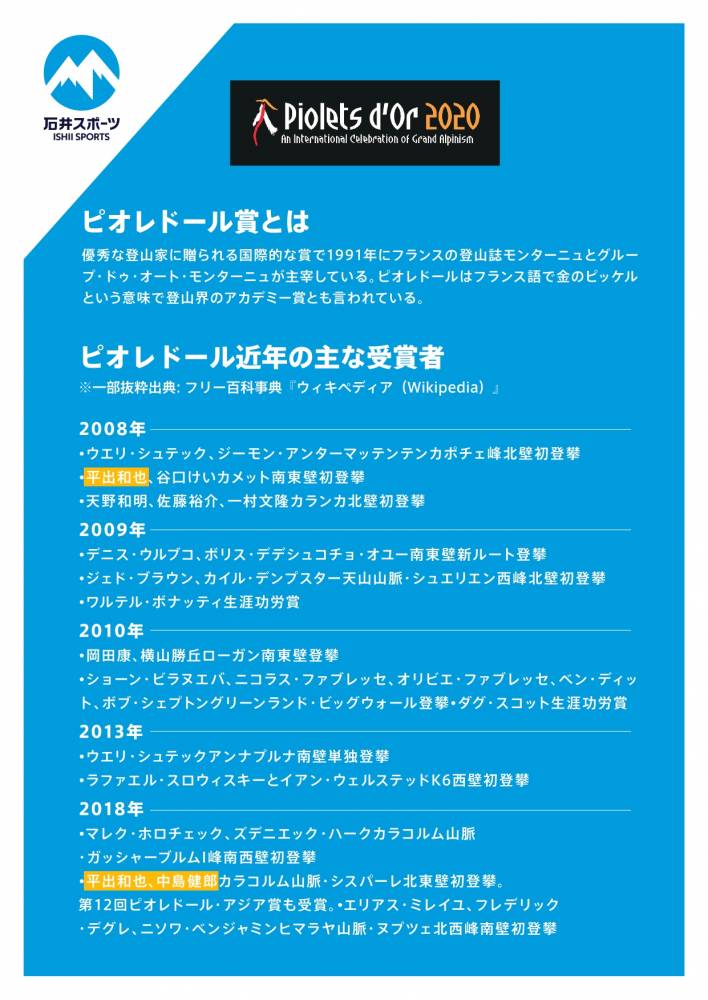 石井スポーツ所属アスリート「平井和也」「中島健郎」が2020ピオレドール賞を受賞することが確定致しました!