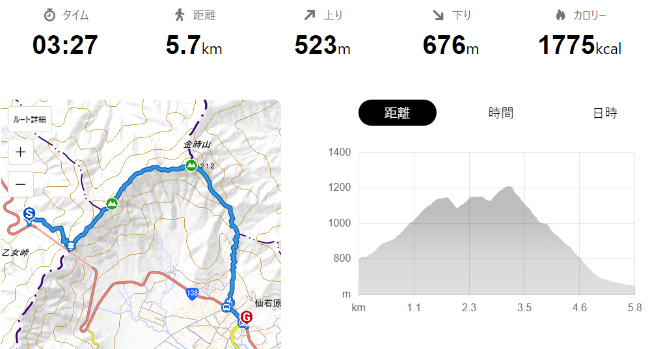 ページトップのヤマップ比高図を見て分かるように、今回のルートの方がやや緩やかに登り、一気に下ります。