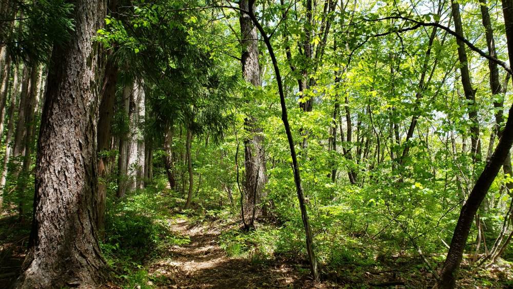 右手に針葉樹が植わっており、左手の南斜面に広葉樹が広がっています。