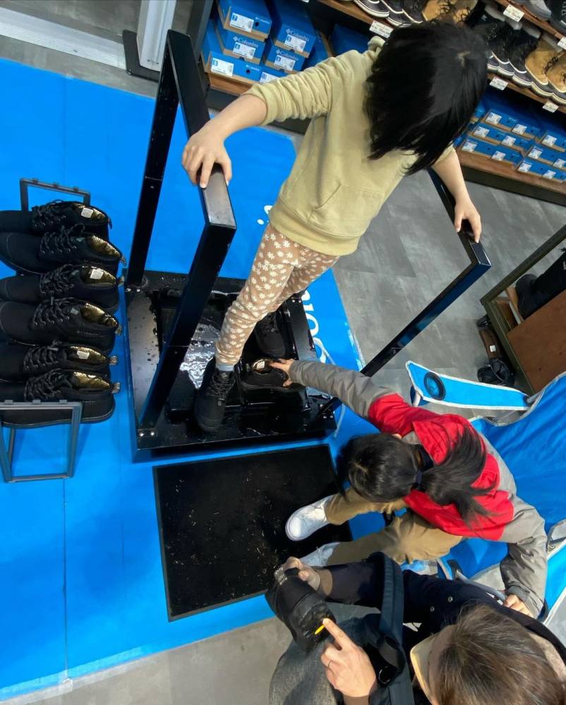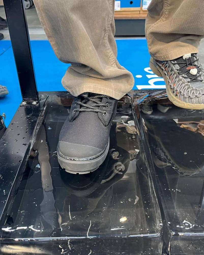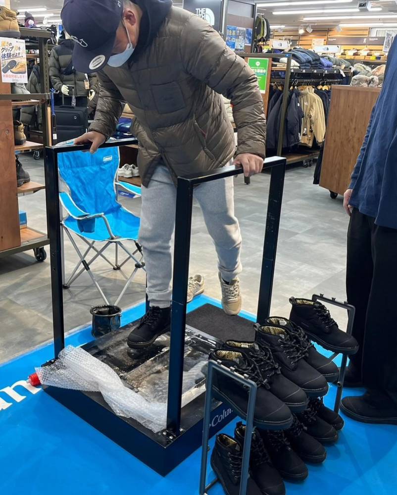 濡れた氷の上でもグリップする防寒靴のその“驚きのグリップ力”は、評判通り、実際に濡れた氷の上で試していただくと、一人ももれなく驚かれて、