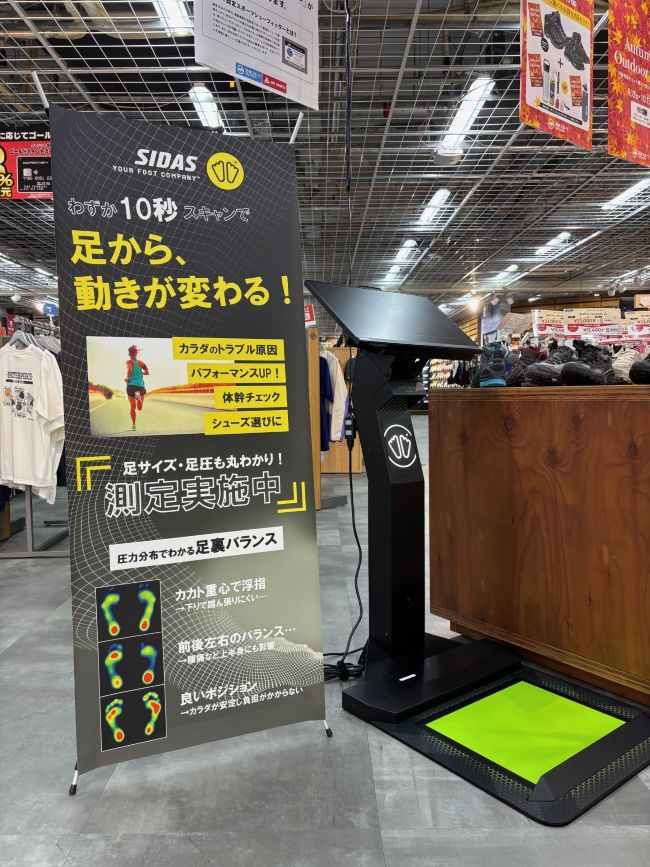 石井スポーツヨドバシ仙台店では、シダスのフィートボックスという機械でお客様の足形を測定してからお客様にあったシューズやインソールをご提案するサービスを行っております。自身の足の大きさや幅・アーチタイプが気になる方は、店頭のスタッフにお申し付け下さい。店頭でお待ちしております。
