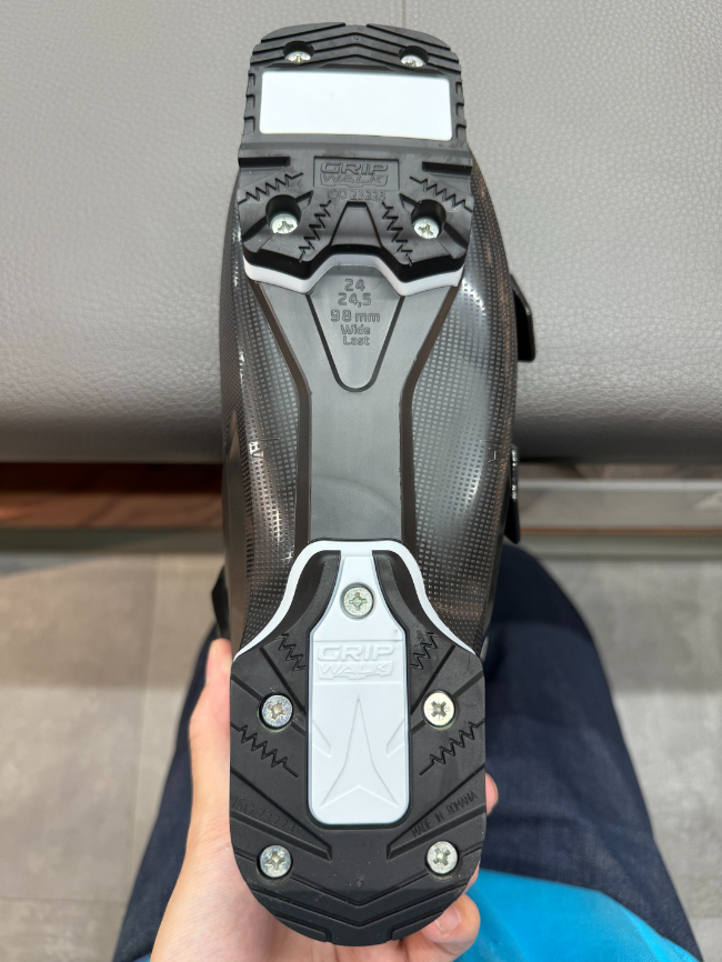 近年多くのスキーブーツに採用されている「グリップウォークソール(GWソール)」は、歩きやすく設計されたつま先の傾斜構造とゴム底が特徴です。