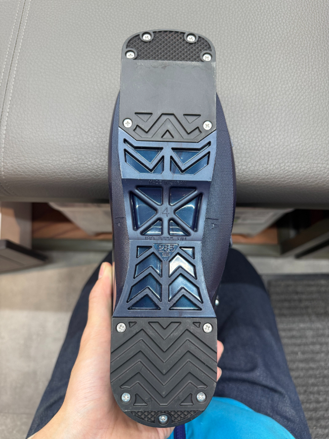 同じアルペンソールでも、一体成型のタイプと、パーツとして付属しているものがあります。軽量化や快適性を求めたブーツに多く、歩いて削れたりしてもパーツ交換が可能です。