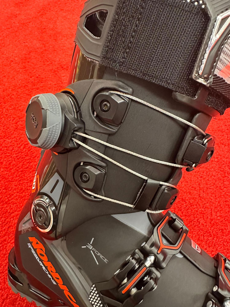 様々なBOAダイヤルのスキーブーツが出ていますが、アッパーシェル(上のシェル)にのみBOAダイヤルが搭載されたブーツはこのブーツのみ。ロアシェル(下のシェル)はバックルで締めることにより、しっかりと足の甲を抑えることができ、さらにアッパーのBOAダイヤルにより足首周りから脛まで綺麗にシェルをラッピングできます。