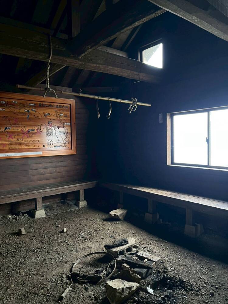強風の為、霊仙山避難小屋で食事をとりながら冷えた身体を温めてひと休み。