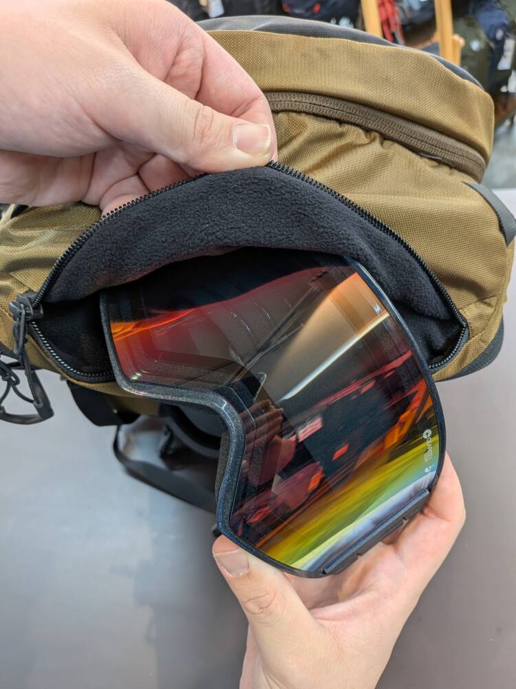 本体上部のゴーグルポケットは、ゴーグルをそのまま収納できるよう、内側が傷付かないようなフェルト素材。