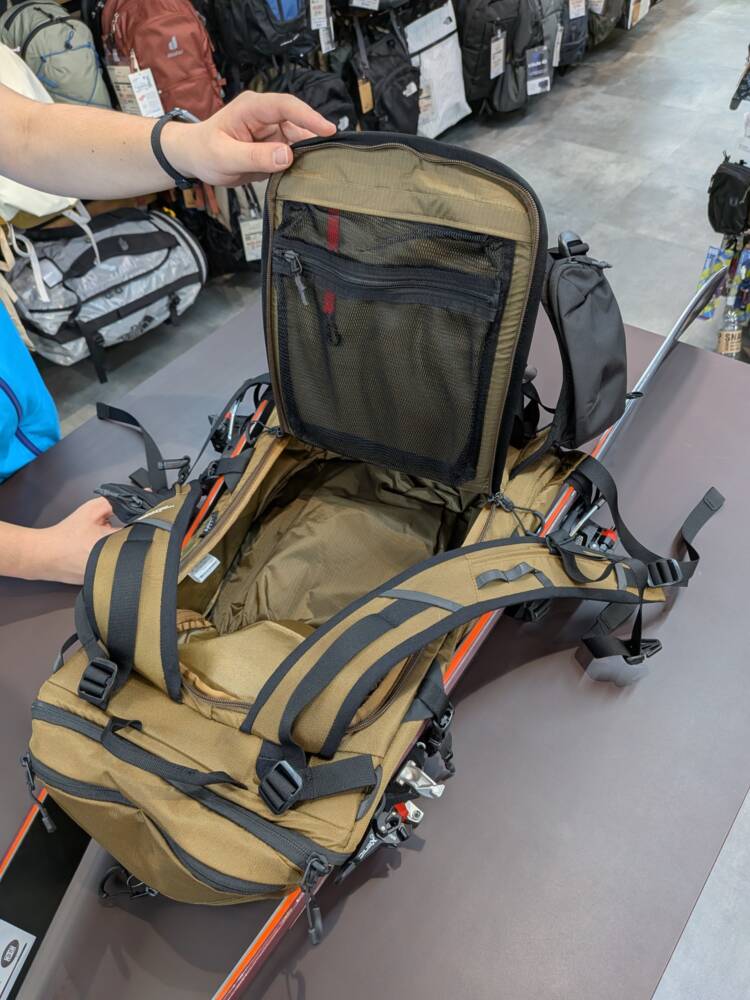 また、スキーを取り付けしている時は、荷物が取り出しにくいので、背面側が開くようになっています。