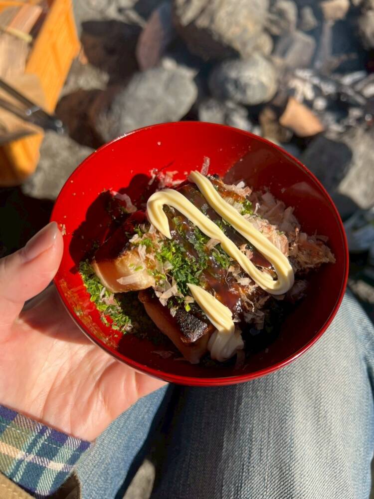 グリドルで焦げ目がつくまで焼いて、ソースと鰹節、青のり、マヨネーズをかけて♪