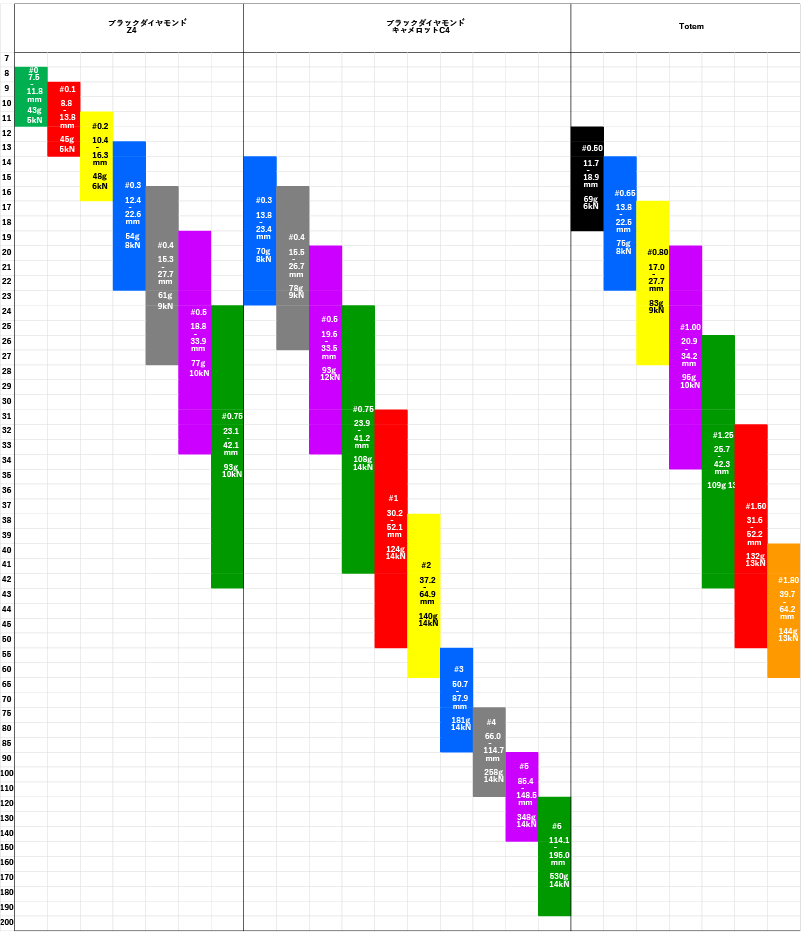 今回はブラックダイヤモンドのキャメロットC4、Z4とトーテムカムのサイズを早見表にしてみました!