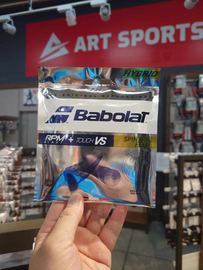 ポリエステル素材のRPM BLASTと、牛の腸を加工したナチュラル素材のTOUCH VSが長さ半分ずつ入っています。