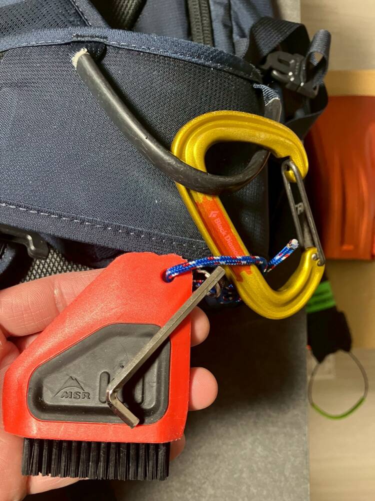 これをザックなどのギアループに付けておけば雪をはらうときにサッと取り出せて便利です。