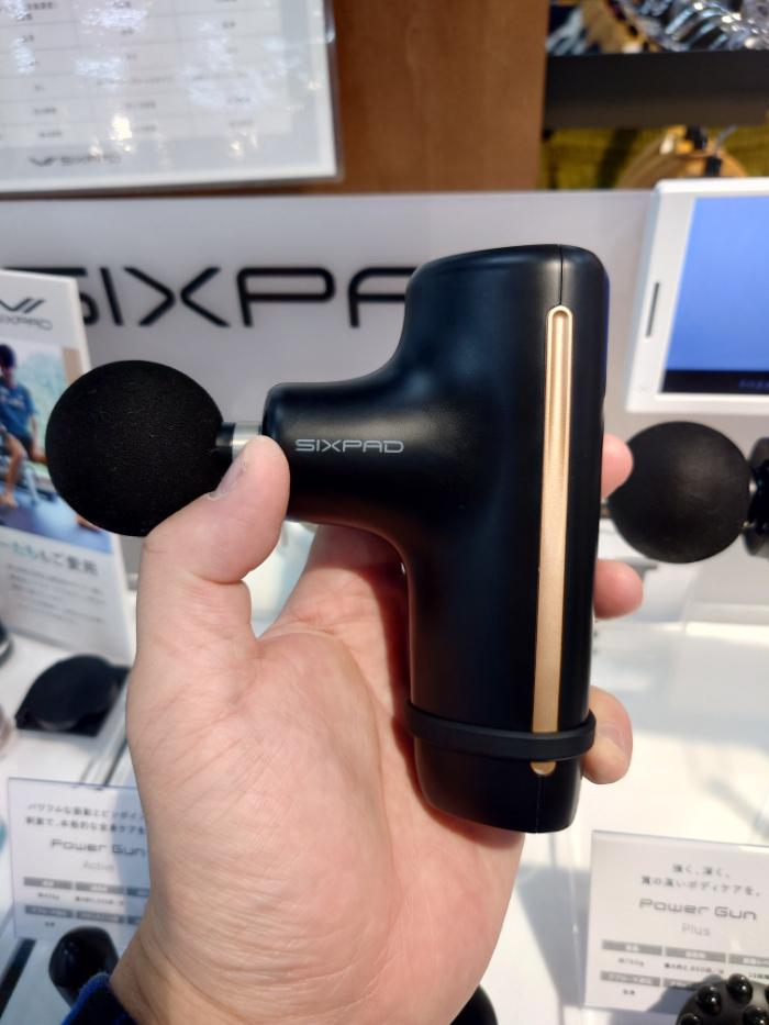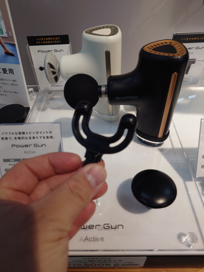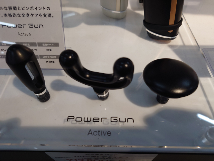 先端が交換できるアタッチメントになっており、形違いで4種類同梱しています。使用したい部位やお好みに合わせて変更できます。店頭でお試しの際はU字型に変えて腕やアキレス腱あたりに使用頂くと、当てた部位周りが軽くなっているのが体感しやすいかと思います。
