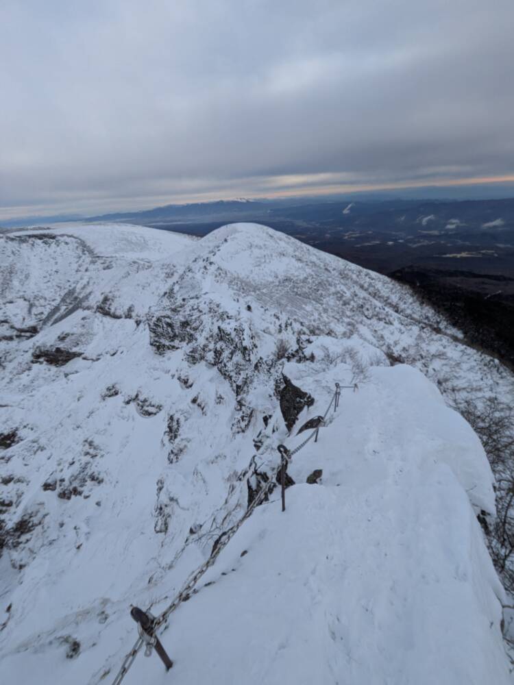 雪が乗っかっている所、飛ばされている所など慎重に足場を選びながら歩みを進め、時にはピッケルをザックの肩ベルトに挟んで両手をフリーにしてハシゴやクサリを通過🚶