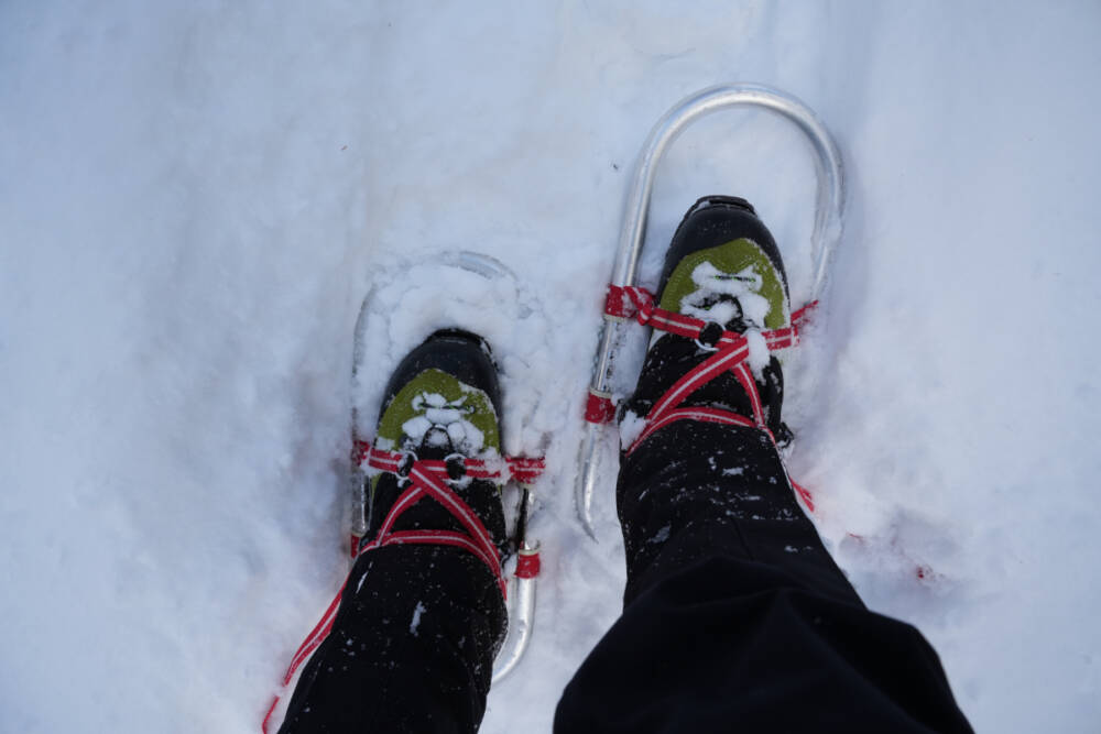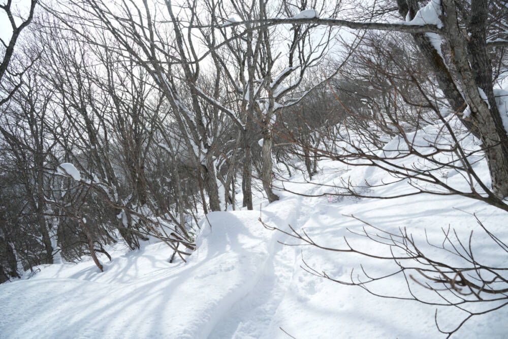 スノーシューによるトレースが残っていたので、スタート後しばらくはアイゼンで歩けましたが、早々にトレース上でもツボ足になる場面も増えてきたので、