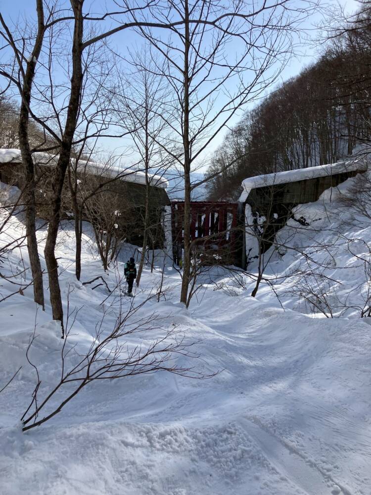 途中、雪崩た形跡のある斜面を通過するので安全を確認になるべく素早く通過します。