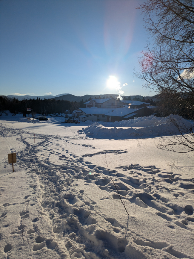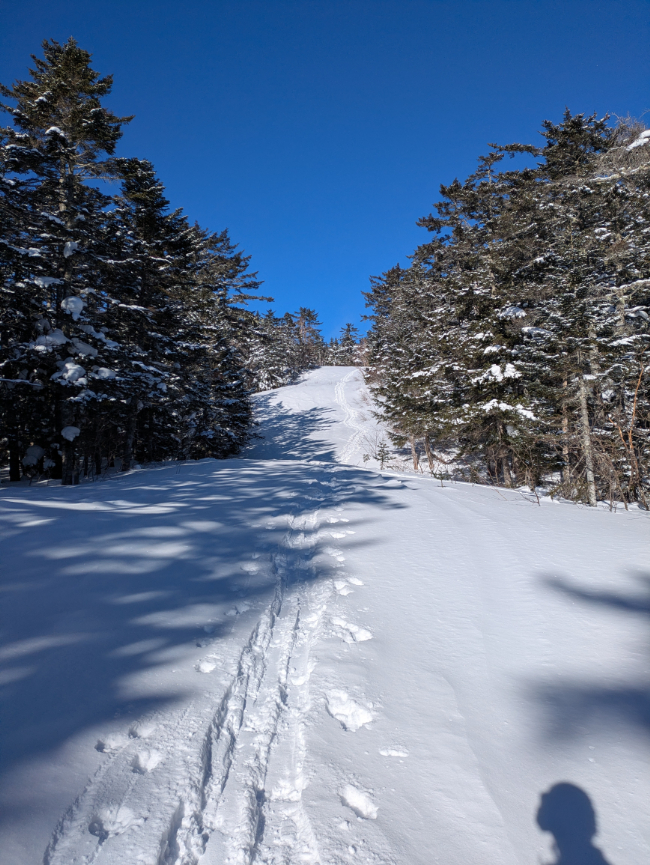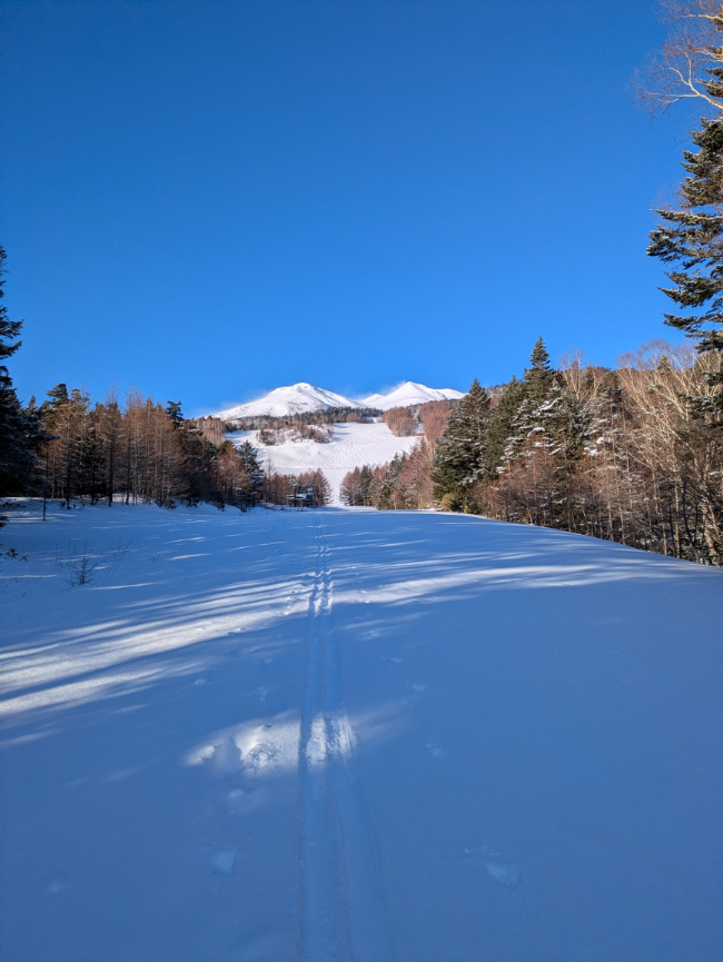 休業中のゲレンデにある登山ルートをシールをつけて登ります。スキー場の営業時間を待てば麓からリフトである程度ショートカットできますが、そこは無課金で歩きます。時間と体力によっては活用できますね。