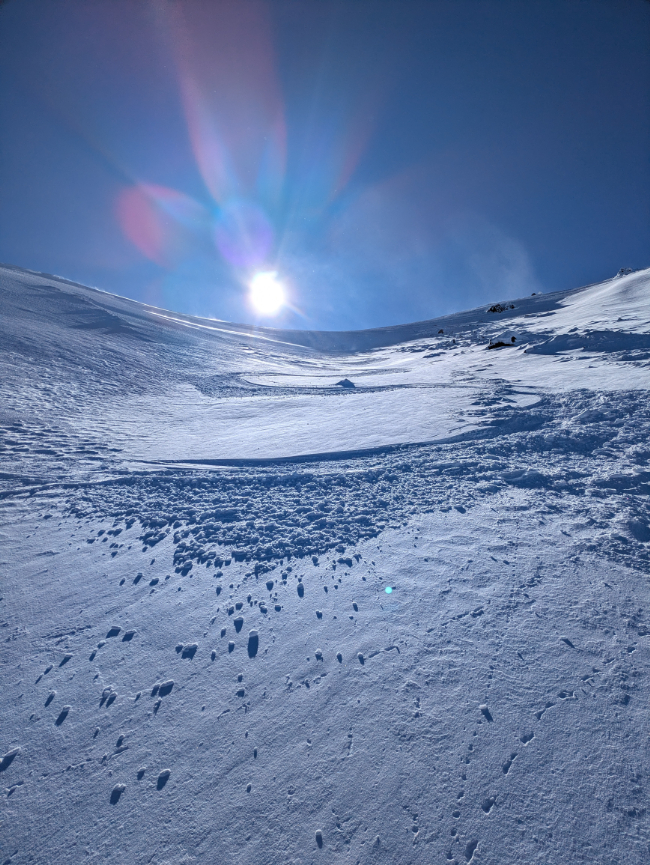 少し降りたところにある朝日岳(2975m)からドロップです。序盤はカリカリのルンゼを滑りますが次第に雪が柔らかくなり至福のパウダーゾーンも出てきます。この為に登ってきました。