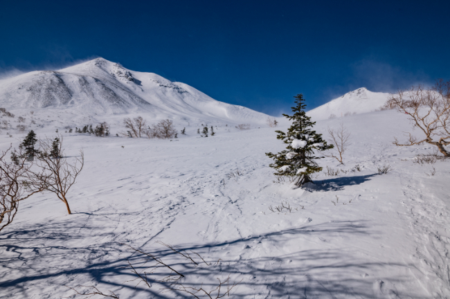 乗鞍岳全体が見えてくると強風に吹かれるので一気に冷えてきます。このタイミングでシェルやゴーグルを装備するのが良いですね。