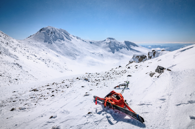 肩の小屋までシールハイクでいけますが、その先の剣ヶ峰までは急な稜線となるので板はシートラーゲンで背負い、アイゼンとピッケルを準備します。