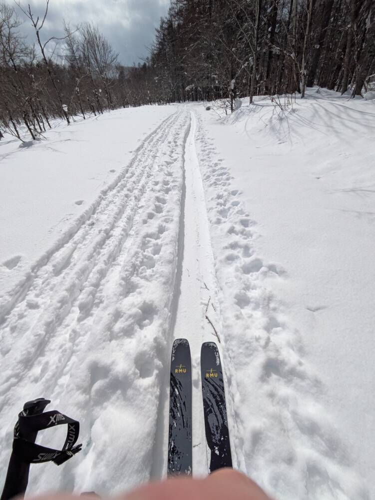 下山中の林道滑走時、ストックで漕ぐ回数が圧倒的に減るので、