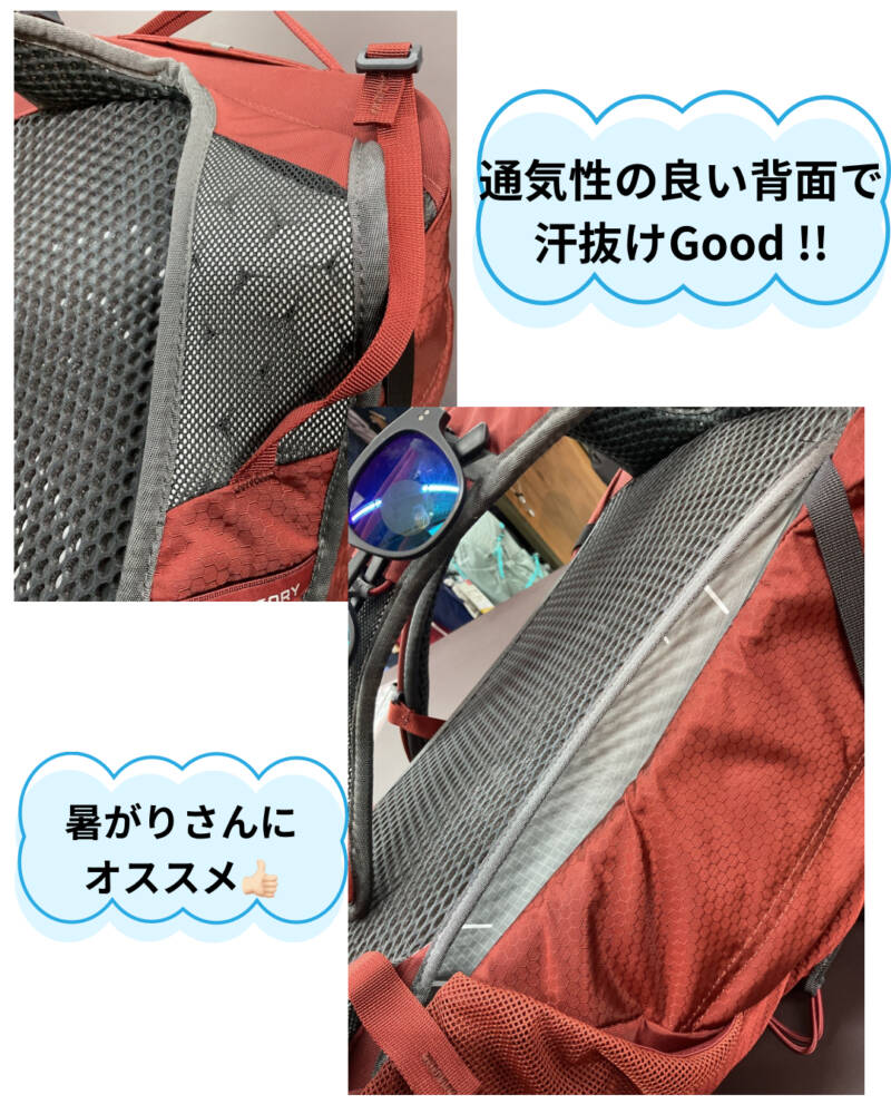 どちらも共通して背面メッシュで涼しく快適に登山が楽しめます!