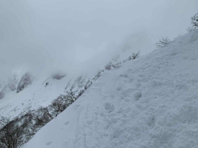 傾斜もきつくなり、一歩一歩の足取りが重くなっていきます。登りもそうですが、特に下りでは要注意ですね。冬山では、下りで勢いがついてしまうと事故や怪我に繋がります。
