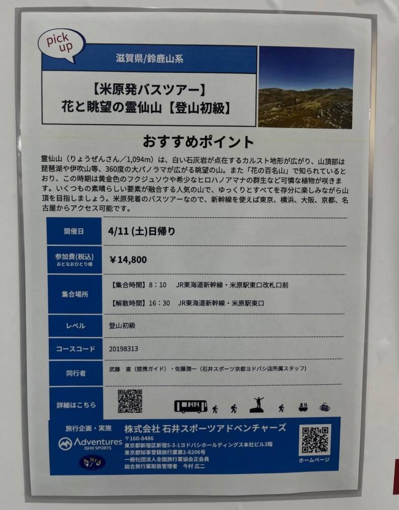 4/11(土)開催予定の石井スポーツアドベンチャーズツアーでは、さらに春らしい霊仙山を楽しめる頃かと思います⛰️🌼