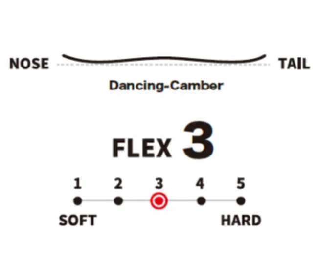 低めに設定されたキャンバーでノーズ、テールがロッカー形状にすることで逆エ