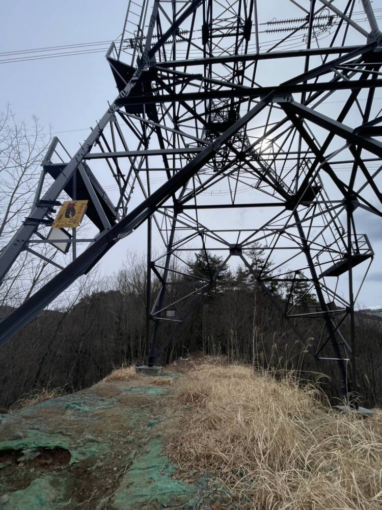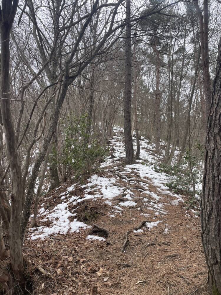 鉄塔を越え、傾斜がキツくなる辺りから先は雪(氷)が登山道ルート上に出てきます。さらに一段登ったあたりからチェーンスパイクの着用が必要になるかと思います。特に大芝方面と山頂への分岐点の手前の北側へ回り込むところからは積雪しています⛄️