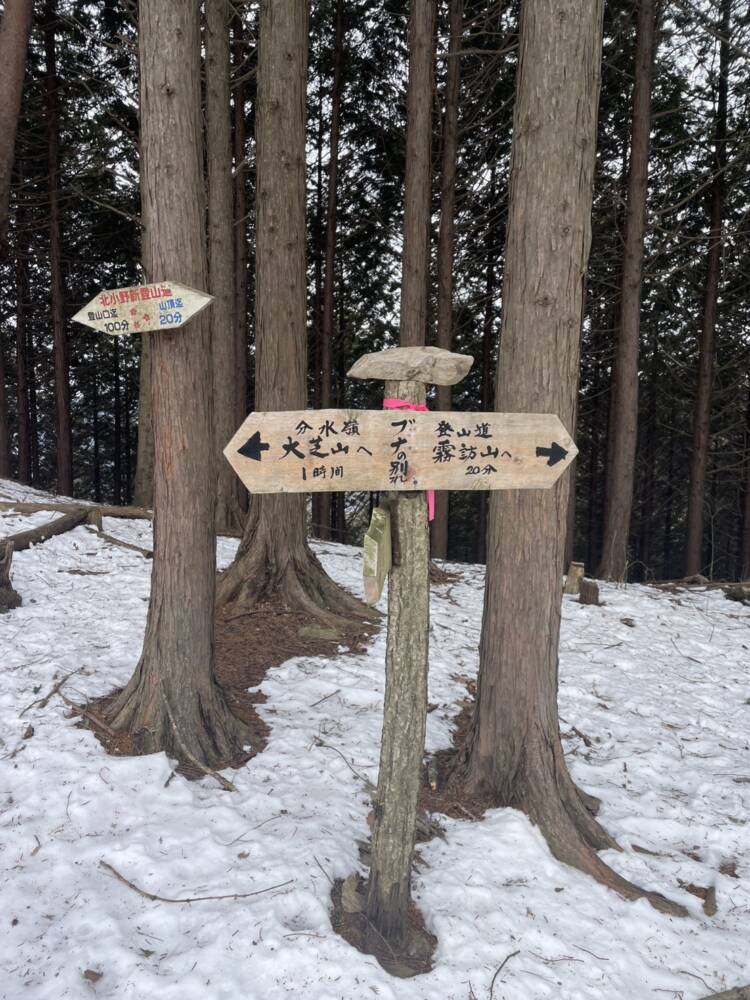 男坂を登りきると山頂まで雪はほぼなく歩きやすいです。この日は天気は曇りでしたが、諏訪湖が見えたり松本平も見渡す事ができました。