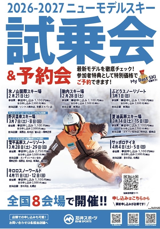 本日、旭川のカムイスキーリンクスにて【2026-2027SKI NEW MODEL試乗会&予約会】を開催中!当日受付もお申込み頂けます。15時まで試乗出来ますのでお近くの方は奮ってご参加ください。