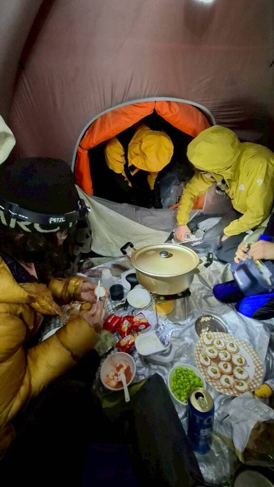 夕飯は4人用テントに集まって箱詰め状態😱