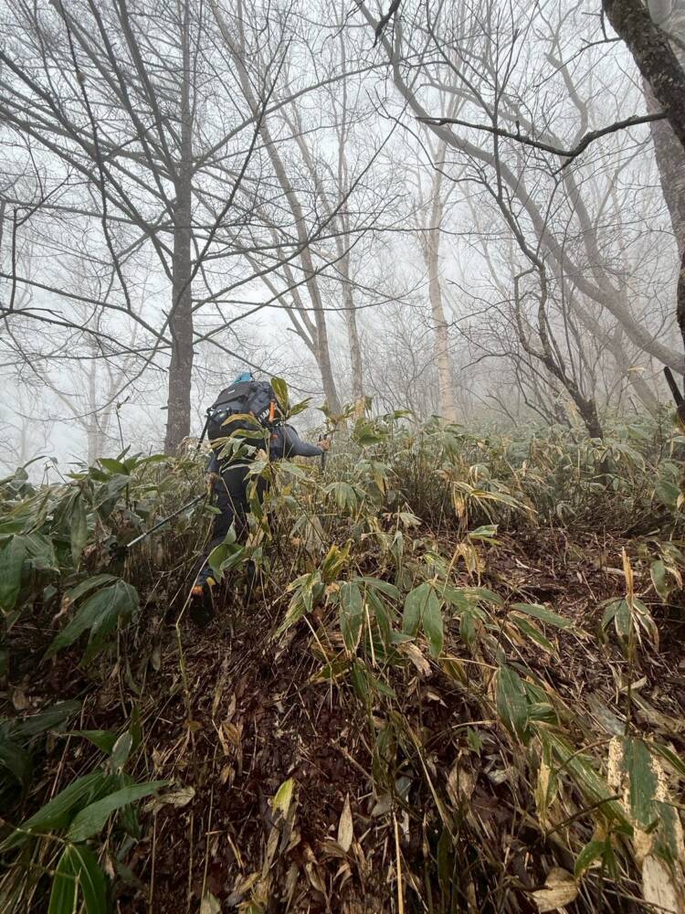 1日目は雪のほぼない尾根登り、歩きやすかった道がいつのまにか藪漕ぎに変わっていきます🌱🌿🌱🌿🌱🌿🌱