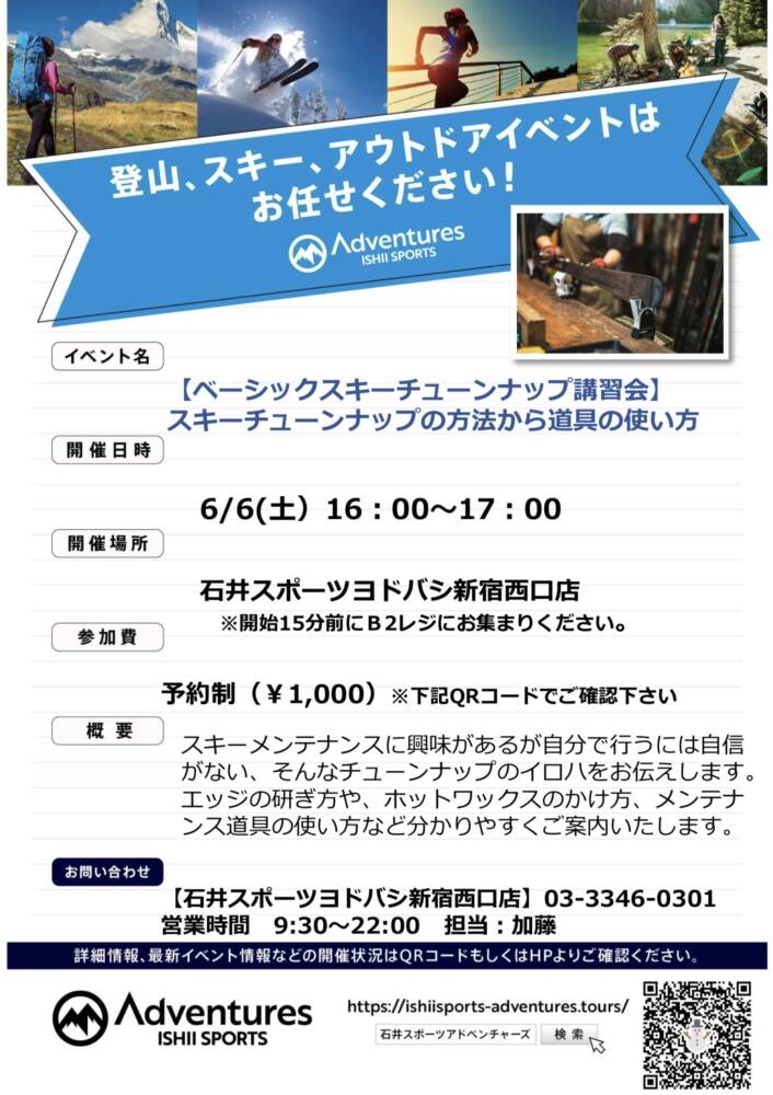 シーズンオフやシーズン中に、自分でスキーをメンテナンスしてみたい!という方は、新宿西口店「スキーチューンナップ講習会」がおすすめです!