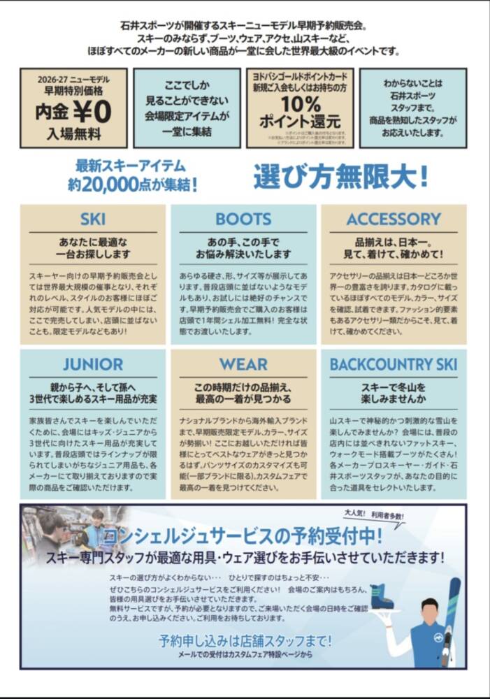 ほぼすべてのスキーメーカーの新商品が一同に会した石井スポーツが開催する世界最大級のスキーニューモデルの早期予約販売会イベント【カスタムフェア】開催が決定。