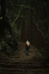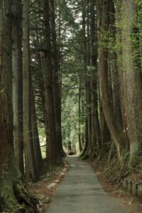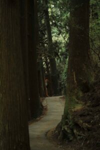 登り始めるとさっそく両端に立派な杉が現れますが山頂付近までずっと続いています。