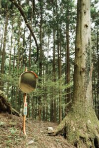 山の中にあるカーブミラーって小さな鏡の中に大きな森が収まっていてなんかいいですよね。